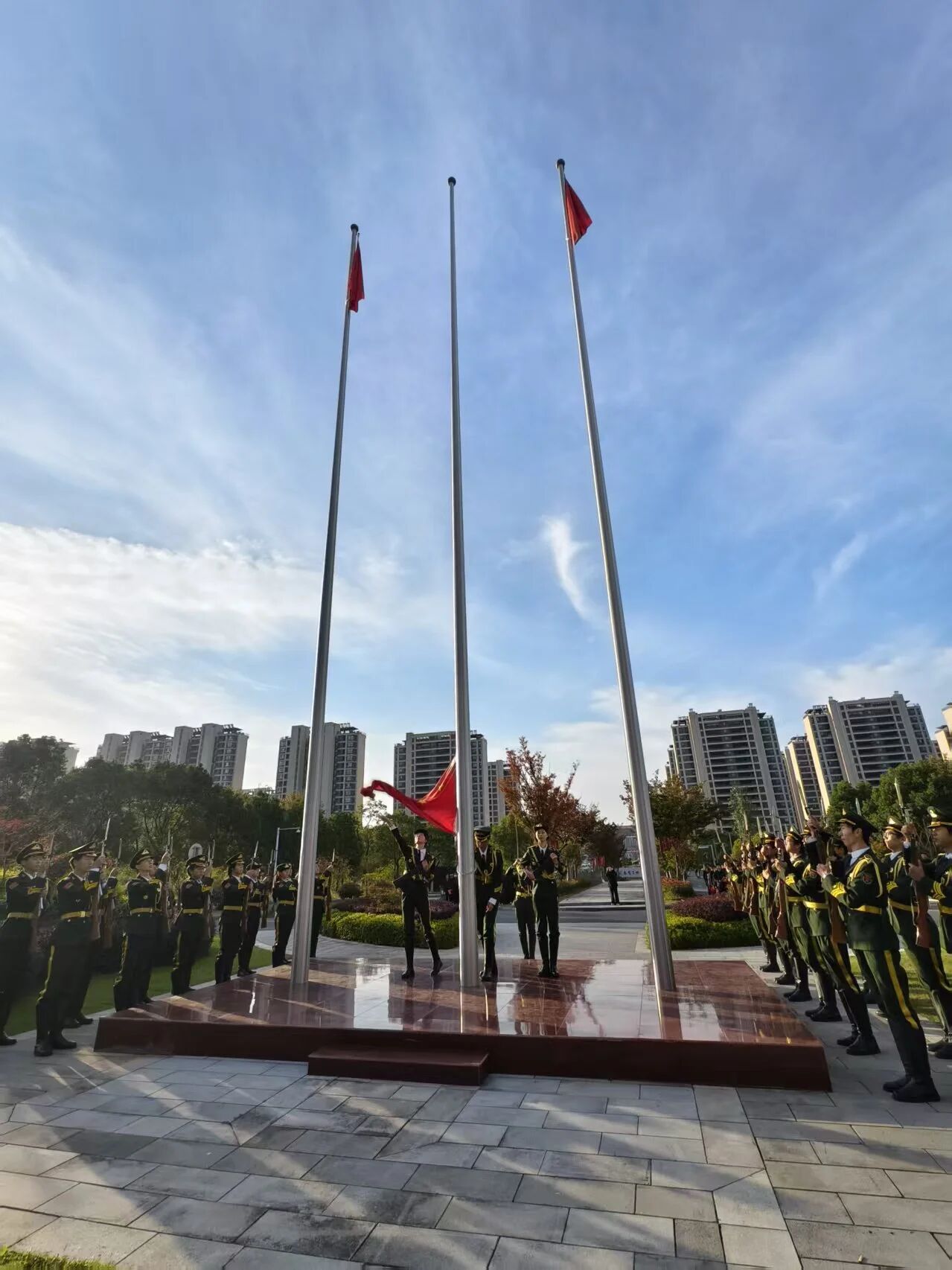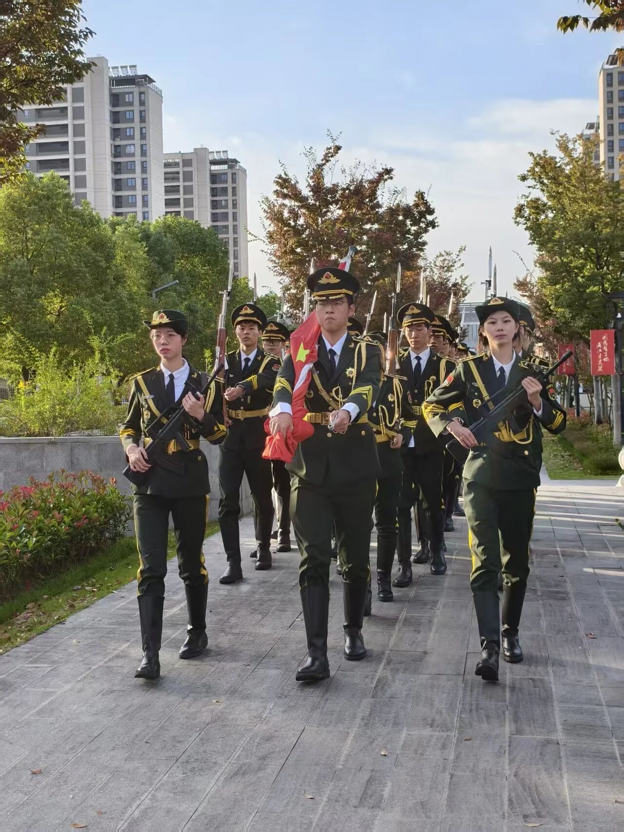 伴随着铿锵有力的步伐,国旗护卫队队员身着整齐制服,精神抖擞、目光坚定,迈着标准的齐步走向升旗台。他们身姿挺拔如松,每一步都踏得坚定沉稳,尽显国护人的纪律与担当。
