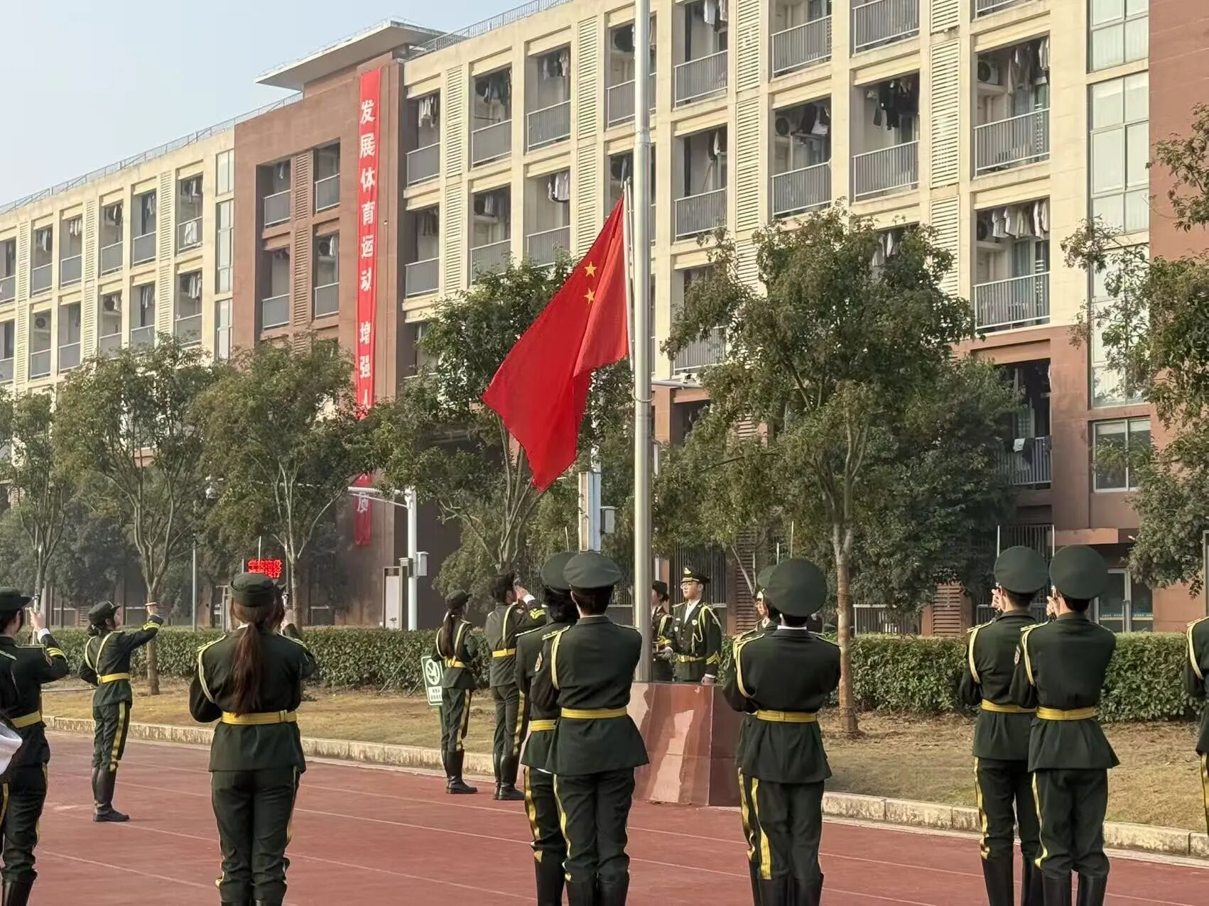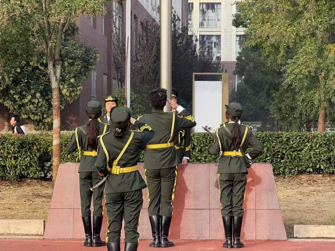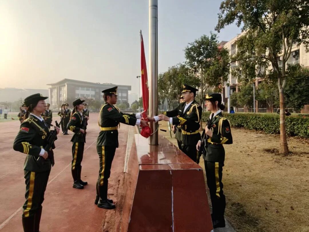 伴随着雄壮激昂的《义勇军进行曲》,五星红旗冉冉升起、迎风飘扬,耀眼的红色在晴空下熠熠生辉。全体师生昂首凝视,神情肃穆,高唱国歌,激昂的旋律回荡在校园每个角落,滚烫的家国情在每个人心中激荡。国旗下,学子们以青春的姿态向国旗致敬,践行诚信立身誓言,筑牢建工担当,让信仰在升旗的庄严时刻深深扎根。